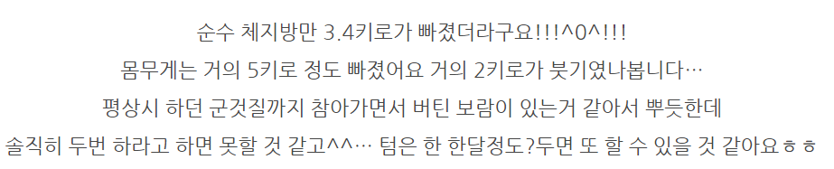 실제 3.4KG을 3일만에 빼고 붓기도 빠졌다는 후기를 볼 수 있습니다. 그런데 3일동안 제대로 먹지 못하는거라 이걸 길게하는것보다는 어느정도 텀을 둬서 몸을 리프레쉬한다는 생각으로 도전을 해보면 좋을 것 같습니다!