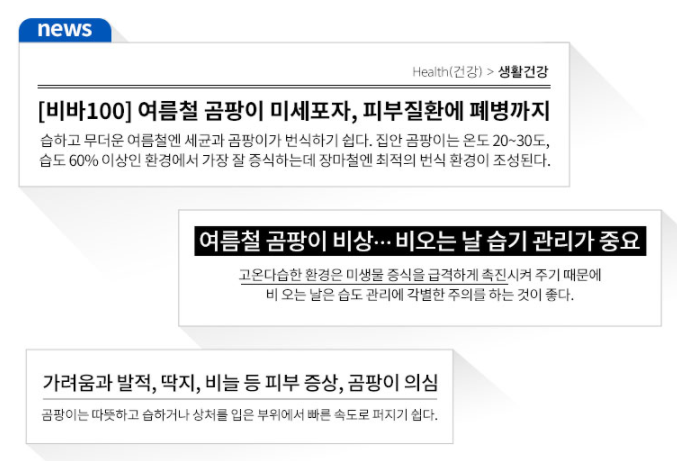 뉴스기사들을 제거해도 자꾸 곰팡이가 재발하는걸 볼 수 있습니다. 특히 여름철에 습할 때 곰팡이 번식이 쉬운데여 집안 곰팡이는 온도 20-30도, 습도 60% 이상인 환경에서 가장 잘 증식하는 환경이 조성되기 때문에 더욱 심해지는 겁니다. 곰팡이가 많이 만들어지면은 가려움과, 딱지, 바늘 등 피부 증상이 일어날 수 있는걸 알 수 있습니다.
