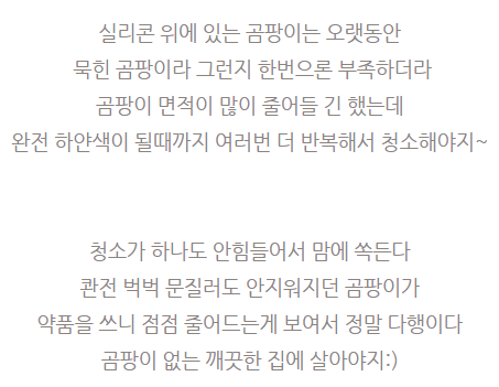 제거젤을 도포한다음에 3시간 이후면은 웬만한 곰팡이는 다 제거되는걸 후기로 알 수 있었습니다. 단, 공통적인 것들이 너무 오랫동안 진눌러있던 곰팡이는 한번에 제거가 힘드니 여러번 시도를 해봐야한다는 점은 참고하라고 합니다.