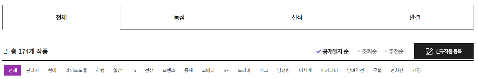 카테고리에는 판타지, 현대, 라이트노벨, 하렘, 일상, TS, 전생, 로맨스, 중세, 코메디, SF, 드라마, 개그, 남성향, 이세계, 아카데미, 남녀역전, 부협, 먼치킨, 게임으로 구분됐습니다. 다양한 소설작가들이 재미난 소설들을 쓴 곳인만큼 다양한 재미가 있는 곳입니다.