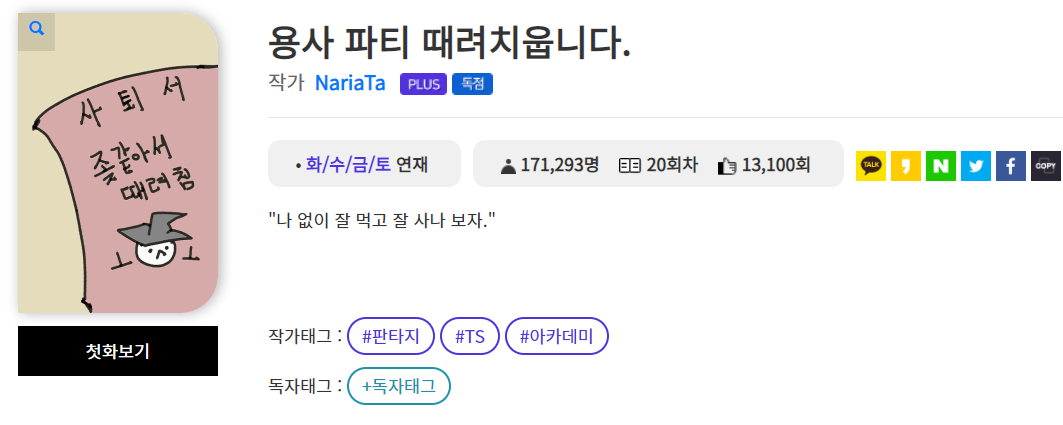 파티라면은 게임 캐릭터에서 함께 싸우는 파티를 의미하는 것 같습니다. 거기서 용사역을 맡는데 때려치우는 이야기인가여? 나 없이 잘 먹고 잘 사나보자라는 문구와 함께 소설이 설명되고 있습니다.