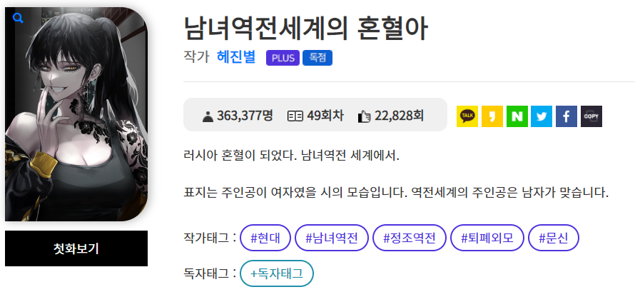 남녀역전세계에서 러시아 혼혈이 됐다는 주제입니다. 아무래도 무한 상상세계의 소설인만큼 가정이 굉장히 신기한 것 같습니다. 과연 남녀역전세계는 무엇일까요? 현대, 남녀역전, 정조역전, 퇴폐외모, 문신 태그를 가지고 있는 소설입니다.
