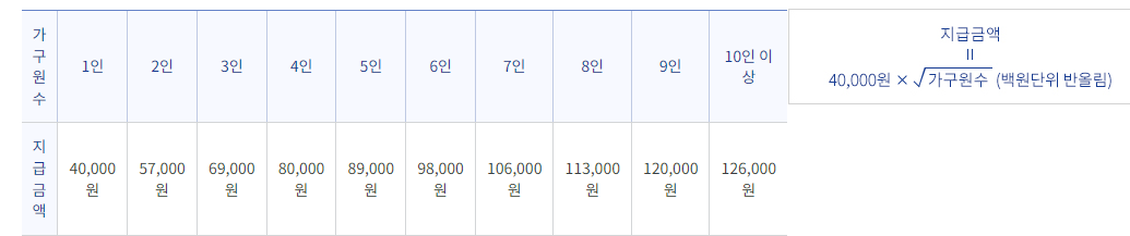 바우처 지원 내용은 소득기준과 특성 기준을 모두 충족하는 가구(시범 지역 지자체에 거주하는 기준 중위소득 50% 이하 가구)에게 지급이 되는데 가구원수에 따라 지급금액 지원내용이 아래와 같이 달라집니다. 1인(40,000원), 2인(57,000원), 3인(69,000원), 4인(80,000원), 5인(89,000원), 6인(98,000원), 7인(106,000원), 8인(113,000원), 9인(120,000원), 10인 이상(126,000원)으로 지원을 하고 있습니다. 1인 가구 기준 최저생계비 계측결과(보건사회 연구원)와 생계급여 식품비를 포함한 사용가능 식품비(행복e음 산출)의 차액을 지원