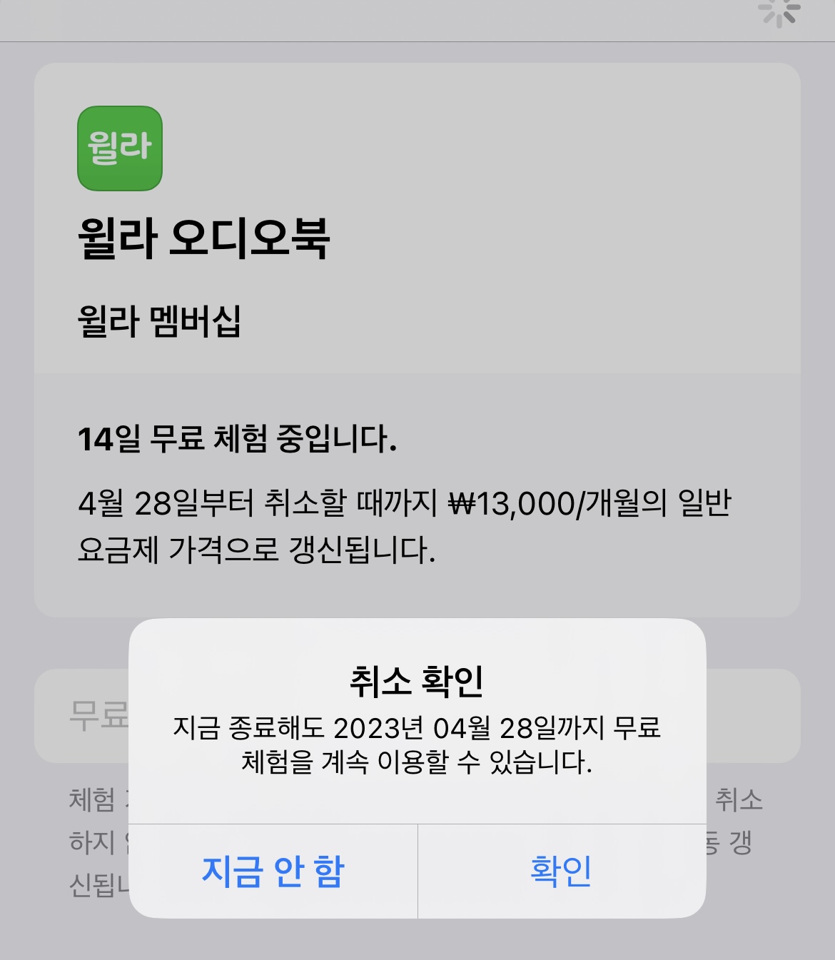 3. 취소를 누르면 '취소 확인(지금 종료해도 2023년 4월 28일까지 무료 체험을 계속 이용할 수 있습니다)라는 창이 나옵니다. 지금 안함은 구독취소를 안한다는 의미기 때문에 '확인'을 눌러 윌라 오디오북을 취소하겠다라고 생각하시면 됩니다. 취소가 완료되면 구독이 곧 만료됩니다라는 안내문이 나옵니다. 윌라 오디오북 구독관리 위치와 취소방법 어렵지 않죠?