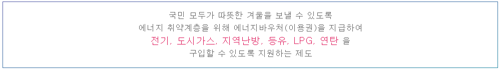 국민 모두가 따뜻한 겨울을 보낼 수 있도록 에너지 취약계층을 위해 에너지바우처(이용권)을 지급하여 전기, 도시가스, 지역난방, 등유, LPG, 연탄을 구입할 수 있도록 지원하는 제도 입니다.