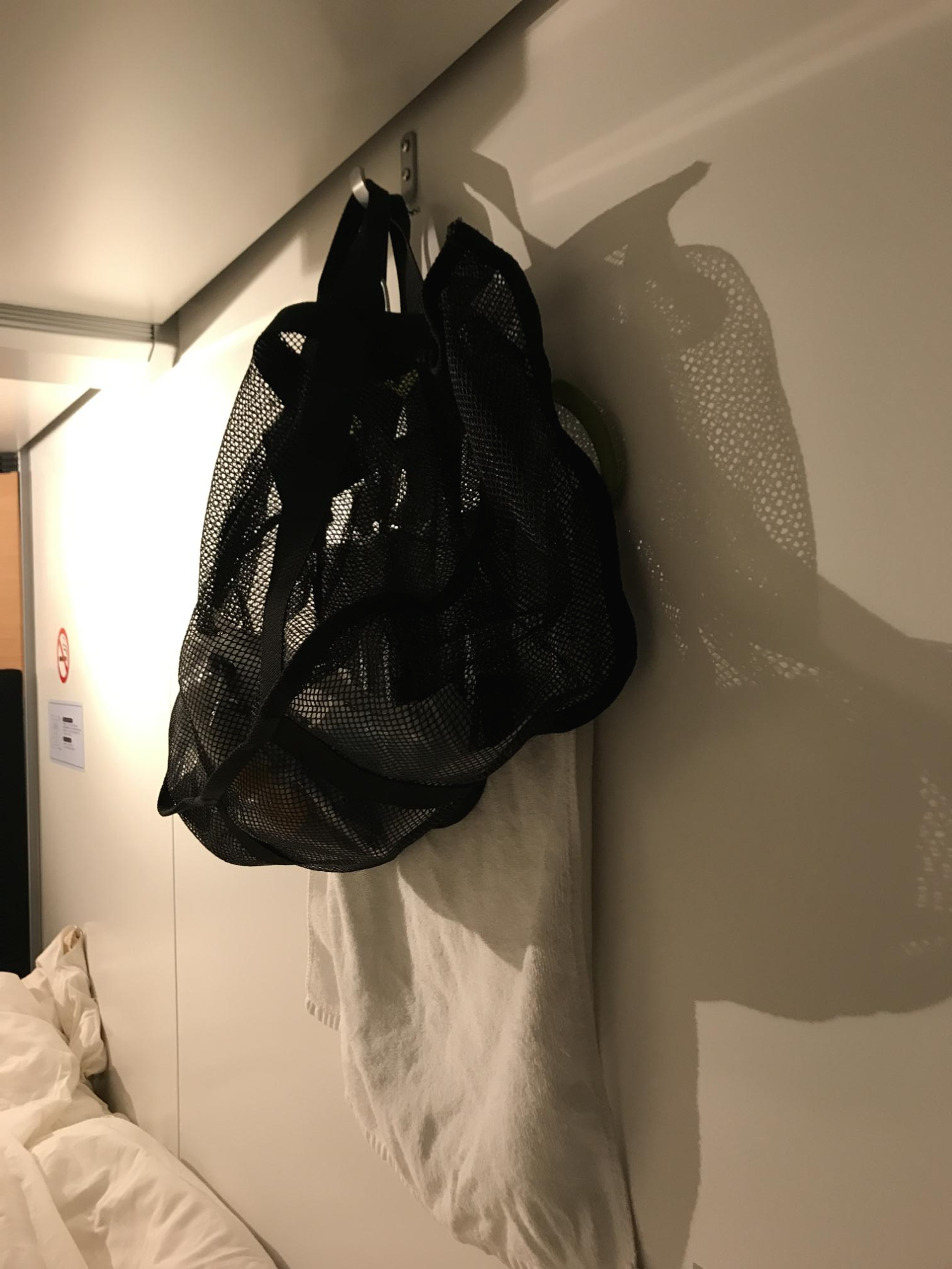 또 사진에 보면은 침대 우측에는 걸 수 있는 고리가 있어서 가방과 수건을 걸어놓을 수 있었습니다. 여름이라 더운 날씨인데도 안에 있는 에어컨이 계속 가동되어 돌아가서 뽀송한 이불을 덮으며 잠을 청할 수 있었습니다. 단, 컨센트가 그렇게 많지 않기 때문에 저처럼 캠코더, 핸드폰 충전 등을 잘 때 동시에 해야하는 분들이라면은 반드시 멀티탭을 가져오시는걸 추천드립니다.