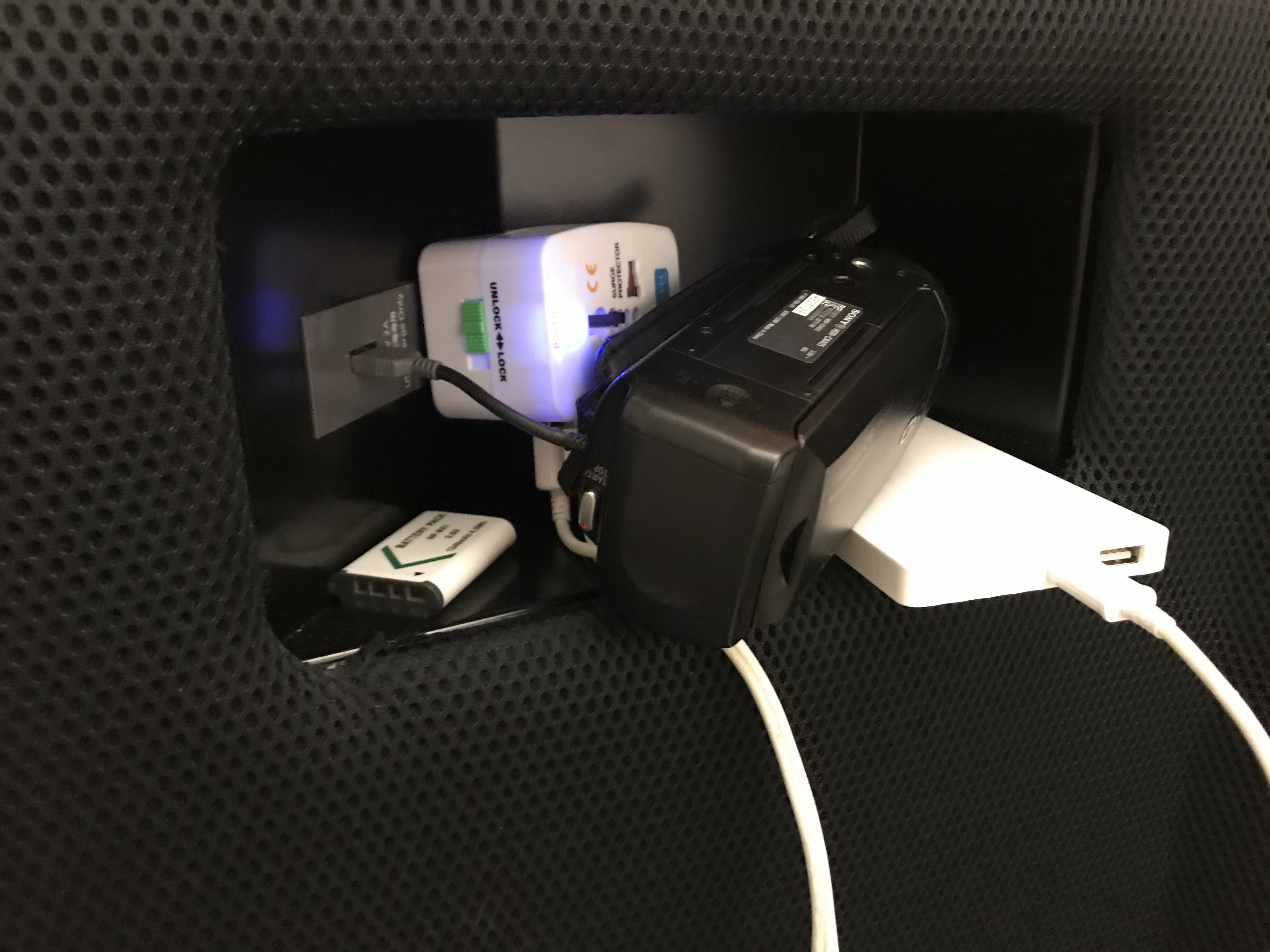 우선 컨센트 1곳, USB 단자 1곳이 있습니다. 전 멀티플러그를 가져가서 이렇게 캠코더, 핸드폰, 보조배터리를 충전을 했습니다. 전력이 조금 약한 것 같아서 보조배터리가 완충이 되지는 않았지만 그래도 나가서 한번 정도는 충전을 할 정도에 충전량을 보유할 수 있어서 충분했습니다.
