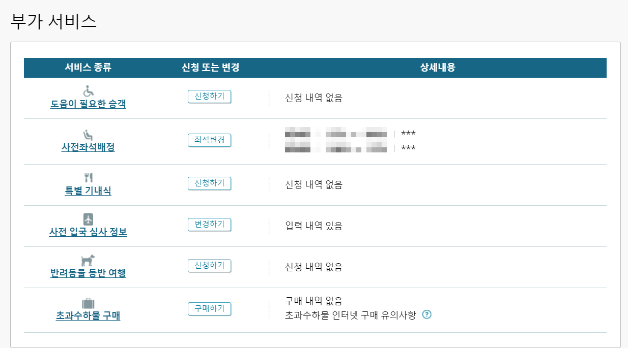 전 대한항공 좌석배정을 예약조회로 선택을 했습니다. 예약번호, 출발일자, 출발지, 목적지, 승객 성 및 이름을 작성해서 조회를 하면은 제가 예약했던 정보들을 볼 수 있습니다. 그 화면에서 마우스를 아래로 스크롤해서 '부가서비스'에 가시면 '도움이 필요한 승객, 사전좌석배정, 특별 기내식, 사전 입국 심사 정보, 반려동물 동반 여행, 초과수하물 구매'가 있습니다.