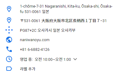 나니와노유 온천 영업시간은 월~금요일은 아침 10시~ 새벽1시, 토~일요일은 아침 8시부터~새벽 1시니깐요 여유롭게 가셔서 온천을 즐기셔도 좋을 것 같습니다. 위에도 이야기했지만 역 바로 옆에 '오사카 시립 주택박물관'이 있기 때문에 같이 세트로 구경하셔도 좋을 것 같습니다.
