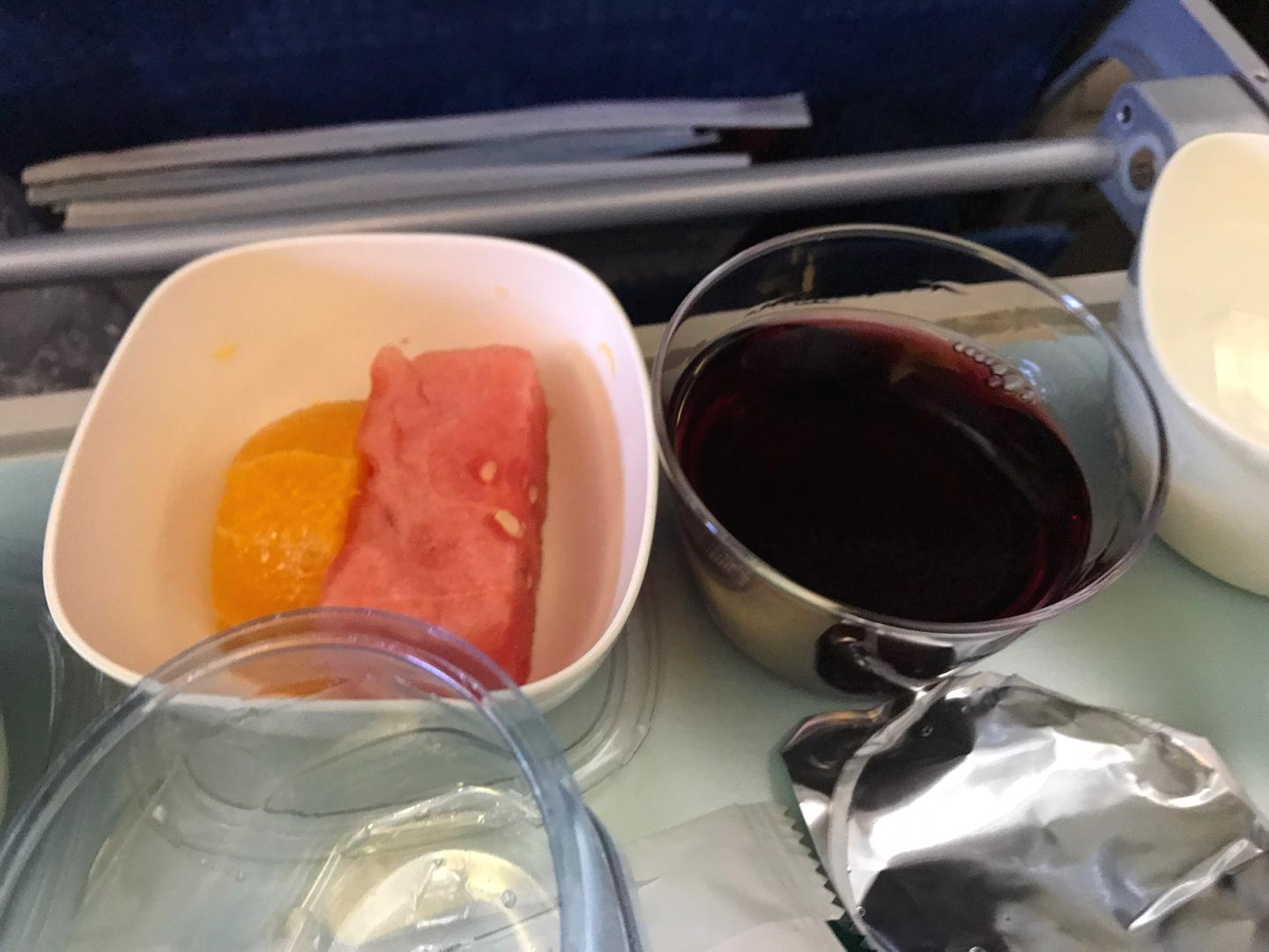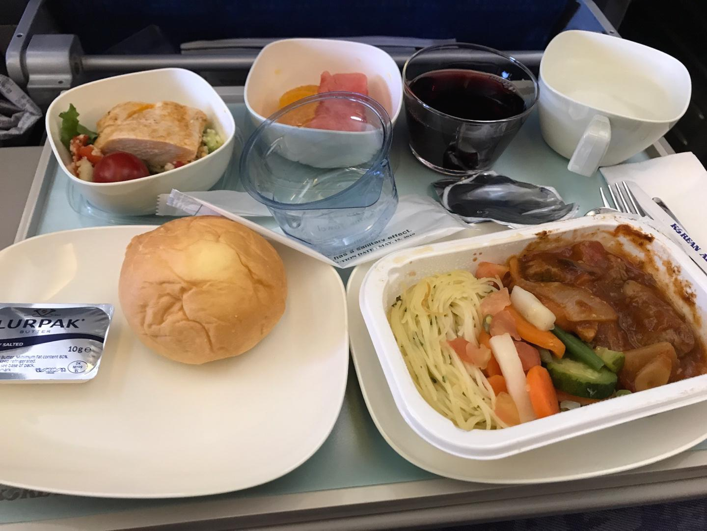 그리고 수박, 오렌지 그리고 저기 아래보시면은 토마토랑 같이 있는게 보이실텐데 바로 닭가슴살입니다. 닭가슴살이라 역시 퍽퍽하지만 레드와인이랑 같이 곁들여 먹으니 맛있었습니다. 평소에는 와인을 안먹는데 비행기 오면은 와인을 먹고싶은건 무엇일까요? TMI이지만 맥주, 막걸리, 와인이 몸에 안받아서 먹으면 금방 숙면을 취할 수 있기 때문입니다. 대한항공 KE0483 기내식 한끼 채우기에 괜찮은 기내식이니깐 비싼 공항 식사에 돈 쓰지마시고 맛있는 기내식 한번 드셔보시는건 어떨까요?
