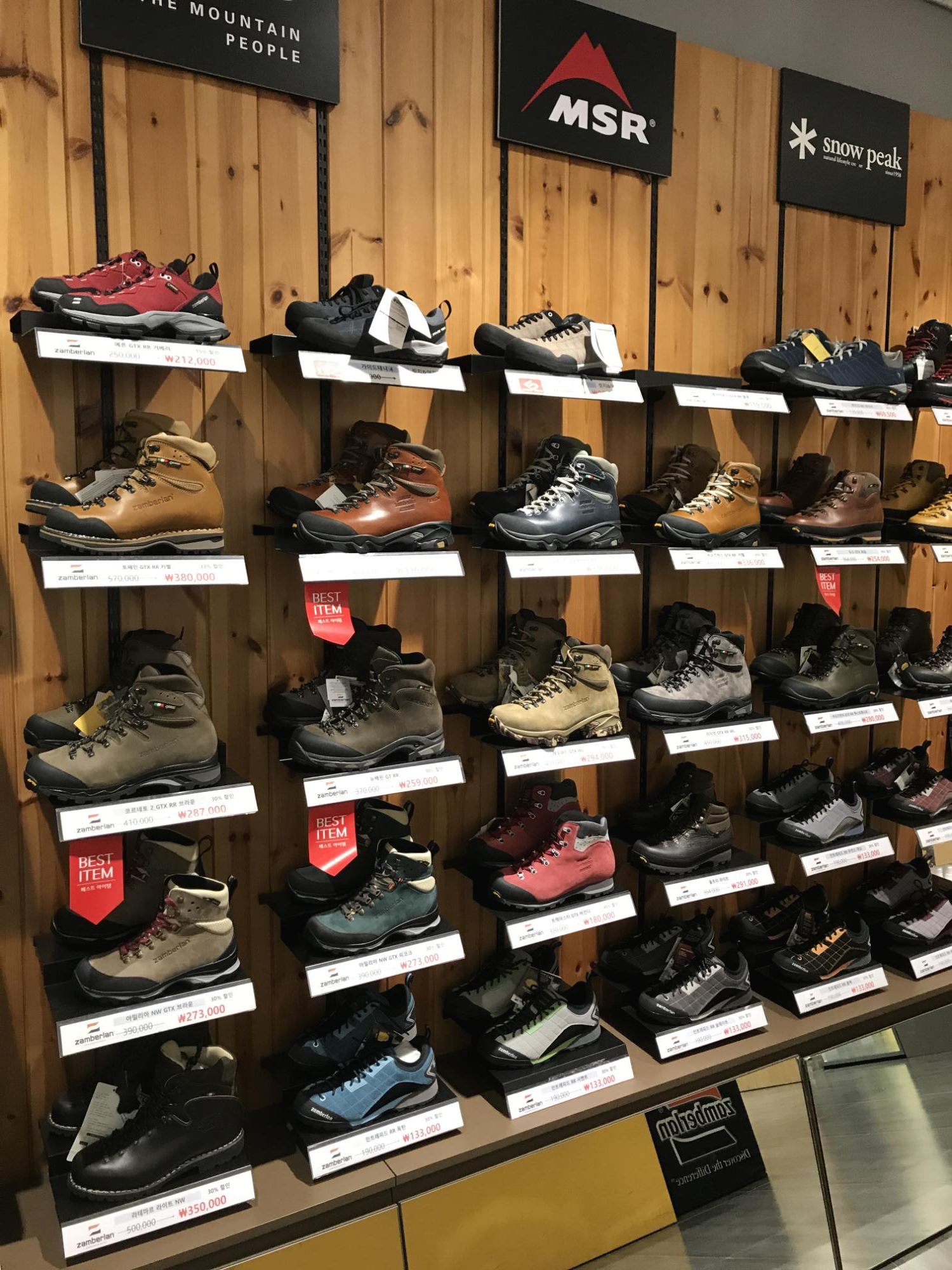 캠핑 신발이 있었습니다. 등산화라고 이야기하면 될까요? 가격대는 10만원 초반대부터 30만 원 후반대까지 있었습니다. 아무래도 고어텍스 기능성 신발인지라 더욱 비싼 신발이 아닐까 생각을 합니다. 평상시에는 신기 힘들고 캠핑 또는 등산을 갈 때 신기 딱 좋지 않나 싶습니다. 그리고 그 옆에는 티셔츠가 있었습니다. 전체적으로 티셔츠는 통풍이 잘되는 기능성 티셔츠들이 많았습니다. 재질을 만져보지 확실히 통풍이 잘되겠구나 싶었습니다.