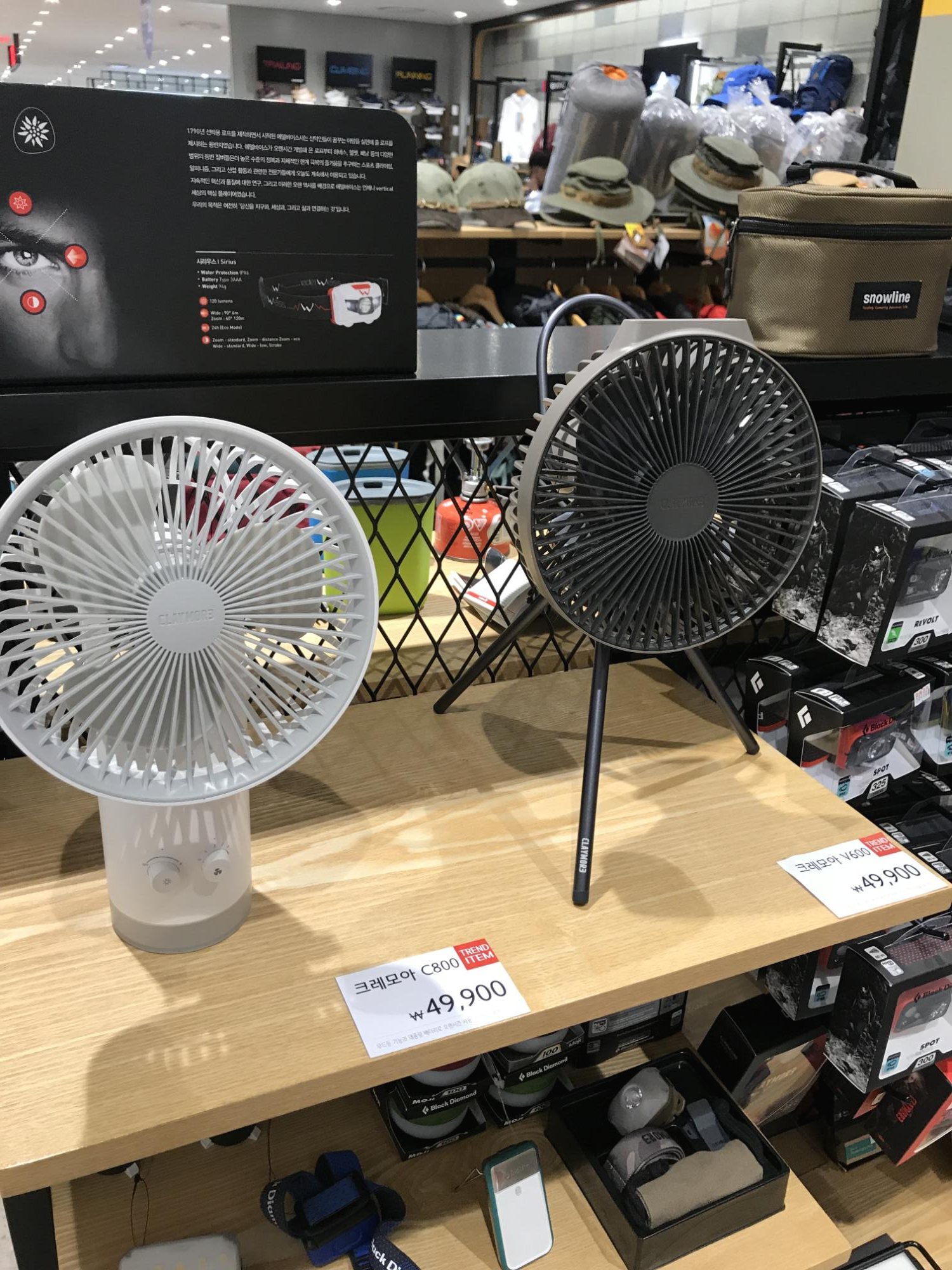 황당한 이름 중 하나는 선풍기가 있길래 봤더니 응? 크레모아? 내가 알고있는 크레모아는 군대에서 적군을 견제하기 위해 사용하는 군사용 무기로 알고 있는데 캠핑장비에서는 크레모아가 캠핑용품 용어로 사용되는 것 같습니다. 대형 선풍기 하나에 요새 4만원정도하는데 이렇게 조금한 선풍기가 49,900원 하는거보면은 확실히 캠핑용품이 비싸긴합니다. 캠핑용품에 대해 모르는 저로써는 이렇게 비싼거라면 아마도 그냥 기능성으로 가벼워서 이런 작은 선풍기를 비싸게 파는구나 생각을 하려고 합니다.