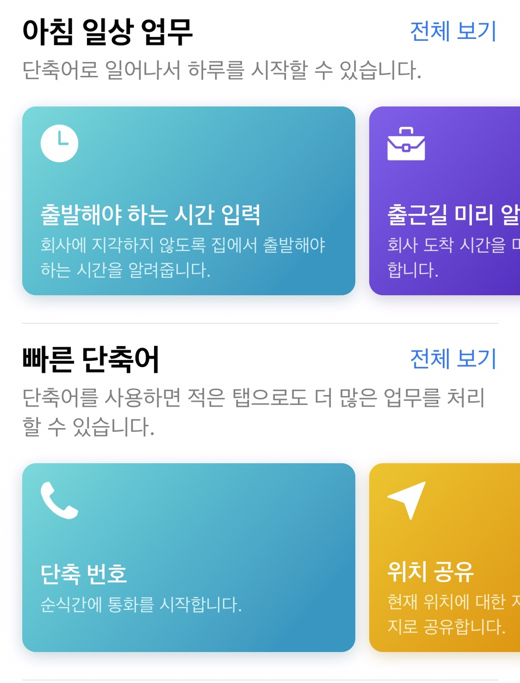 제가 사용하는 기능을 글을 작성하면서 소개를 드리겠습니다. 아침 일상 업무, 빠른 단축어 등 일상생활 및 업무에 활용할 수 있는 기능들이 있습니다.