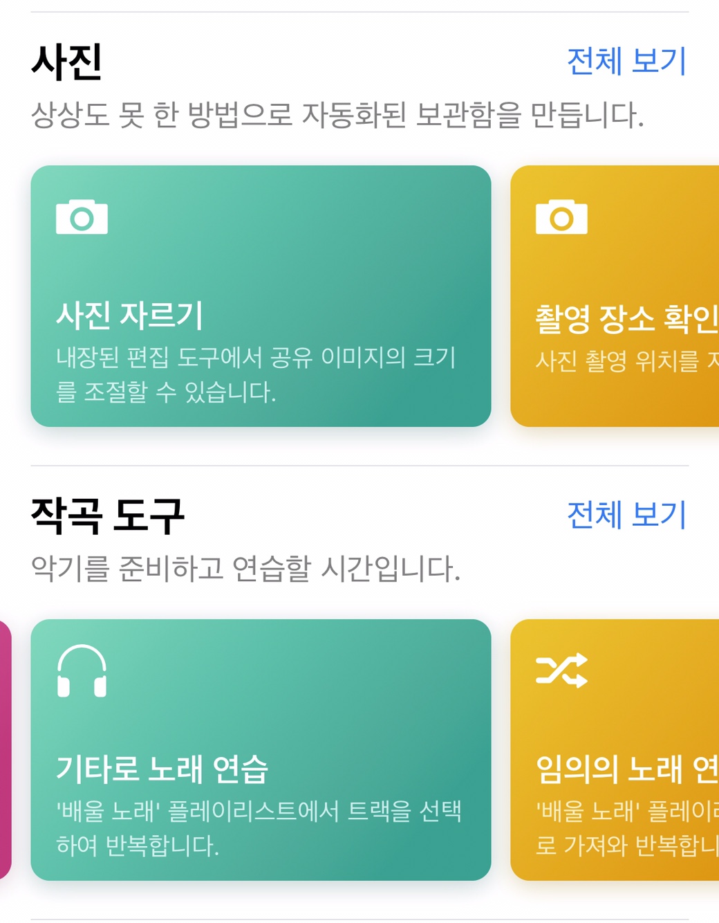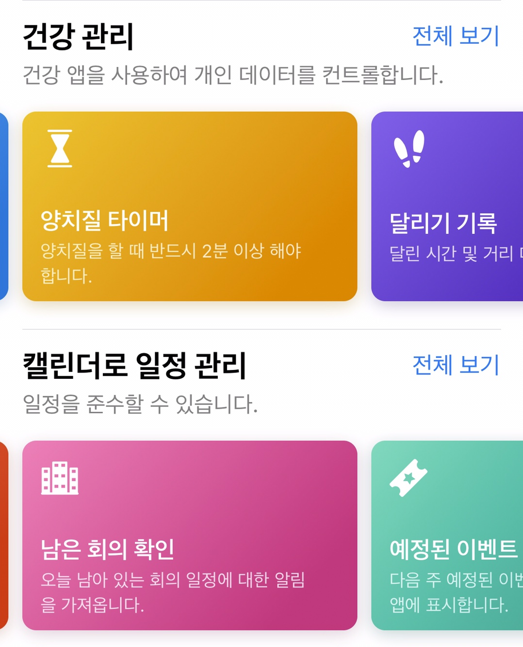 그래서 사실 이 기능 하나만으로도 저는 만족을 합니다. 하단에는 추천항목, 건강관리, Apple Music 찾아보기, 캘린더로 일정관리 등 카테고리별로 유저들이 쉽게 이해할 수 있도록 구분을 해놨습니다. '양치질 타이머'기능과 같은 재미난 기능들도 있네요! ㅋㅋ 양치질은 반드시 2분 이상 해야하는 점을 이제야 알았네여!
