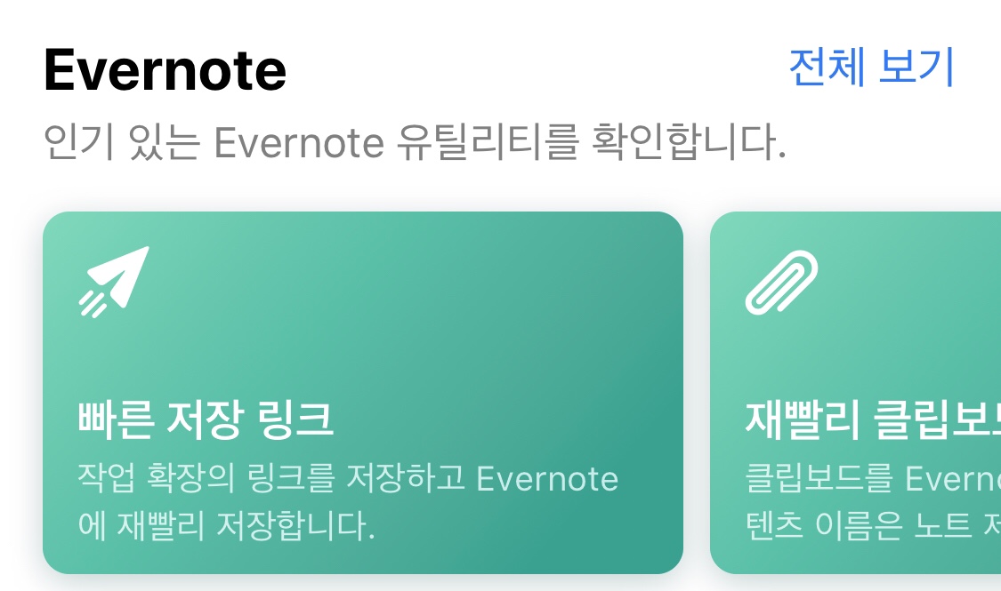 그 중 반가운 기능이 있다면 바로 Evernote기능입니다. 제가 업무 중 가장 활용도가 높은 에버노트 입니다. 빠른 저장 링크, 재빨리 클립보드 저장, Watch에서 새 메모 추가, Evernote에 클립보드 추가, 문서공유, 녹음추가 등이 있는데 다 유용하지만 저에게는 지정한 위치 노트열기가 있으면 좋겠네여! ㅋㅋ아무튼 아이폰 추천어플 단축어 강추합니다!