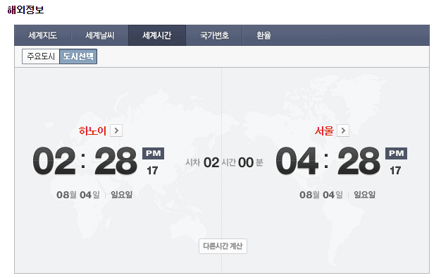 한국시간 오후 4시 28분 기준으로 볼 때에 하노이는 지금 오후 2시 28분입니다. 즉, 한국이 베트남보다 2시간이 빠르다는걸 볼 수 있습니다. 2시간 정도면 크게 차이나는 정도가 아니기 때문에 시차적응하는데 큰 무리는 없을거라 생각을 합니다. 요새 핸드폰 같은 경우 자동으로 현지 시간을 맞춰주기 때문에 상관이 없지만 시계같은 경우에는 베트남 공항에 도착하셔서 2시간을 빠르게 맞춰주시면 베트남 시차 시간을 해결할 수 있는 것 같습니다.