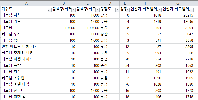 위에 있는 사진이 바로 처음 엑셀로 다운받은 Raw data입니다. Keyword 부분에 보시면은 베트남 외에 '여행, 캠핑카, 장가계, 효소 등' 제가 원치 않는 키워드들이 보이죠? 이런것들을 다 정리할건데 정리하는 방법을 아래 사진과 함께 설명을 드리도록 하겠습니다.
