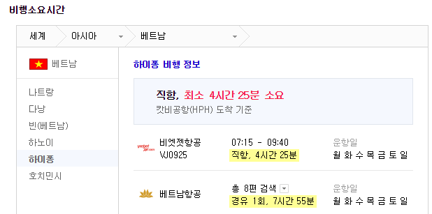 그리고 인천국제공항에서 하이퐁까지 비행시간은 하노이보다 15분이 더 소요되는 4시간 25분 입니다.