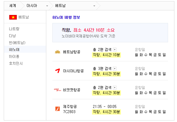 인천국제공항 ↔ 베트남 북부(하노이, 하이퐁) 비행시간