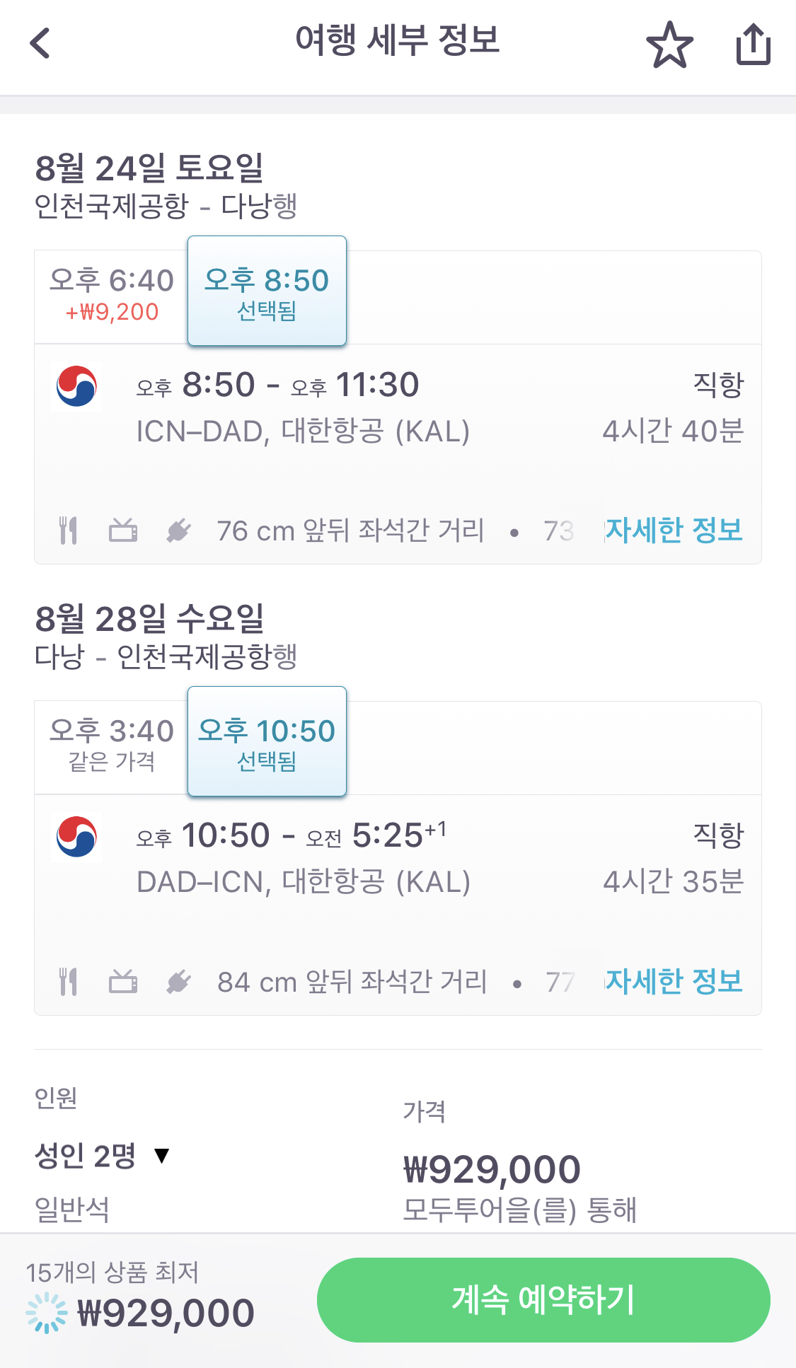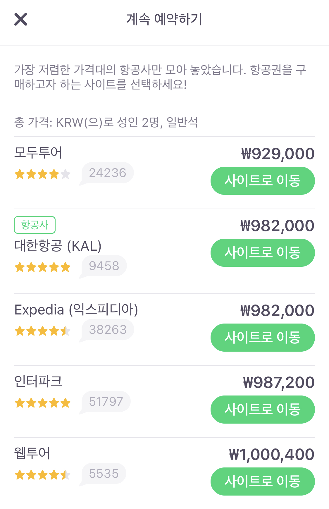 값을 설정 후 가격대와 항공권을 구매할 수 있는 구매처가 쭉 나타납니다. 그렇다면 내가 원하는 곳에 가셔서 항공권을 구매하시면 됩니다. 가장 저렴한 곳이 모두투어(929,000원)이고 그 다음으로 대략 60,000원 차이가 나는 대한항공(KAL)이네요! ㅋㅋ이럴 경우 전 당연히 모두투어를 신청합니다. 6만원 차이면은 베트남가서 숙박을 한번 더 할 수 있는 금액이기 때문에 당연히 더 저렴하게 나와있는 '모두투어'를 선택해야 하는 것입니다.
