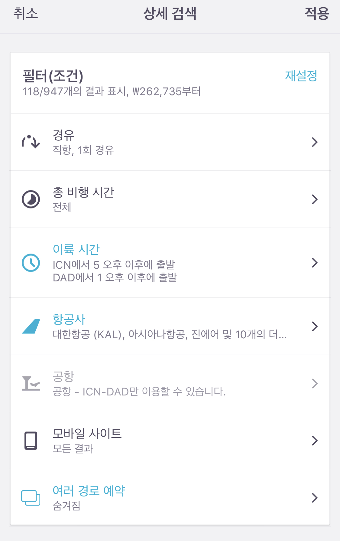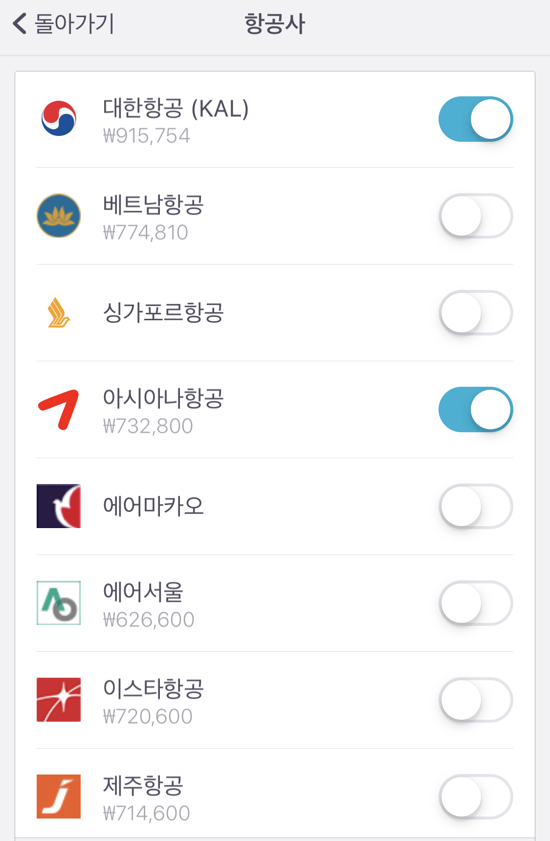 항공사를 눌러서 대한항공, 베트남항공, 싱가포르항공, 아시아나항공, 에어마카오 항공 등 여러 항공사 중에 내가 검색하고자하는 항공사를 선택 후 돌아가기를 선택합니다. 마찬가지로 시간대를 눌러서 내가 출발할때 귀국할때 시간을 설정한 후 돌아가기를 누르면은 내가 원하는 필터대로 결과값이 나타납니다.