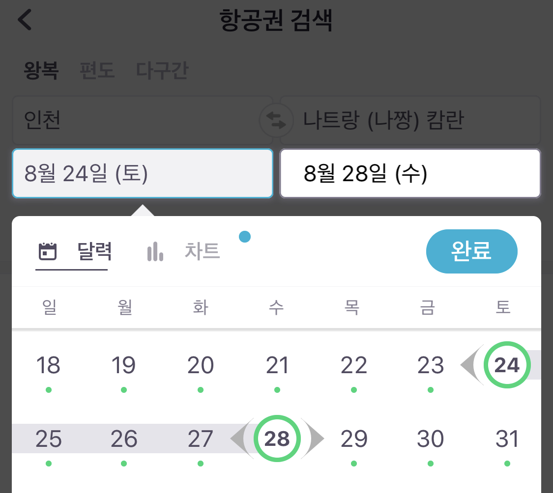 어플에 접속하시면 상단에 항공권/호텔/렌터카가 있습니다. 저는 비행기 예약 어플로 포스팅을 작성하려고 하니깐은 위에 '항공권'만 보시면 좋을 것 같습니다. 항공권을 누르시면 우선 설정해야 할 값은 바로 날짜, 출발하는 곳, 도착하는 곳을 설정해주셔야 합니다.
