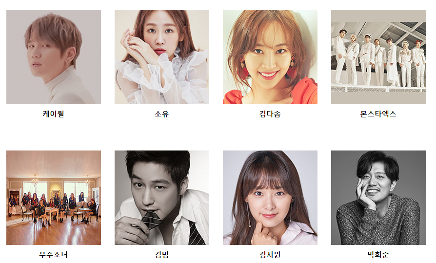 케이윌, 소유, 김다솜, 몬스타엑스, 우주소녀, 김범, 김지원, 박희순, 송승헌, 송하윤, 유연식, 이광수, 이동욱, 이미연, 임수정, 조윤희가 있습니다. 여기서 제가 가장 좋아하는 연예인을 손 꼽아보자면 '이동욱'이 아닐까 생각을 합니다. 남자가 봐도 멋있는 배우 짱짱맨!