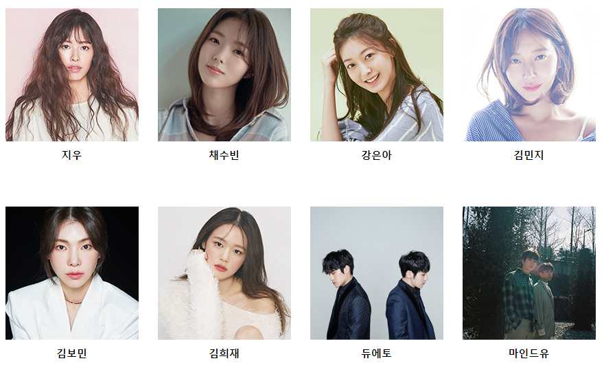 지우, 채수빈, 강은아, 김민지, 김보민, 김희재, 듀에토, 마인드유, 브라더수, 샵건, 신승호, 신지연, 오소현, 오아연, 오혜원, 유승우, 이루비, 이수민, 이엘리야, 이종화, 장정연, 정세운, 정원창, 정주연, 정준원, 조윤우, 주영, 지일주, 최원명, 최희진, 한민이 있습니다. 여기서 반가운 얼굴이 있다면 바로 '최희진'입니다. 사실 누구야? 할지 모르지만 제가 즐겨보는 네이버 웹 드라마에 나온 여주인공이거든요! ㅋㅋ