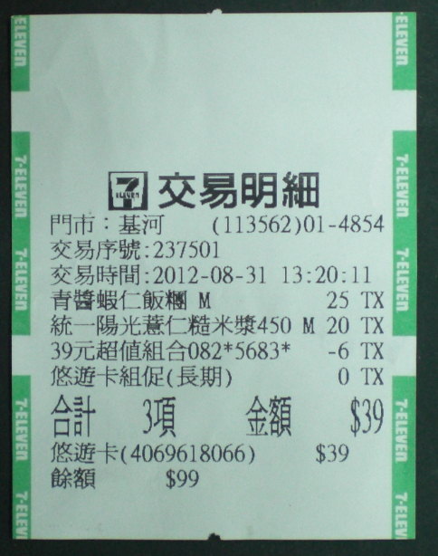대만 여행을 다니면서 물건을 결제하면은 이렇게 QR코드가 박힌 영수증을 받을 수 있습니다. 이런 사실을 모르는 사람들은 한국에서 하는것처럼 '영수증 버려주세요! 라거나 영수증을 쓰레기통에 버리겠죠?' 하지만 QR코드가 담긴 종이가 바로 복권입니다. 그러니 버리지 마시고 챙기시면 될 것 같습니다.