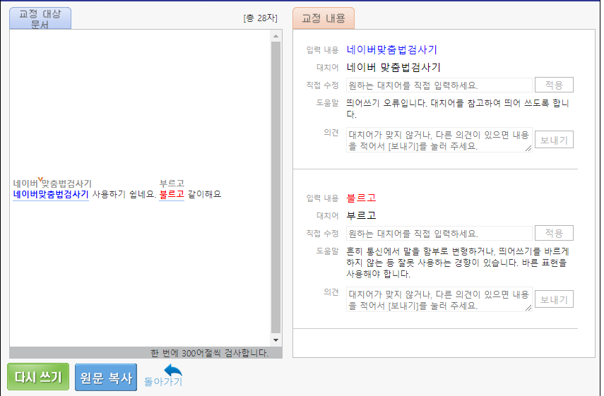 입력내용, 대치어, 직접수정, 도움말 등이 담겨있습니다. 위에 예시는 조금 부실한 것 같으니 실제 제가 얼마전에 작성한 포스팅 글을 넣어서 한번 검사를 받아보겠습니다.