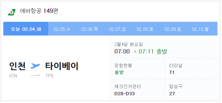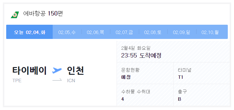 타이베이에서 인천으로 오는 비행기편인 에바항공 BR150 편입니다. 타이베이에서 8시 20분 정도에 출발해서 한국에 도착하면 약 11시 55분 도착하고 비행시간은 약 2시간 30분 입니다.