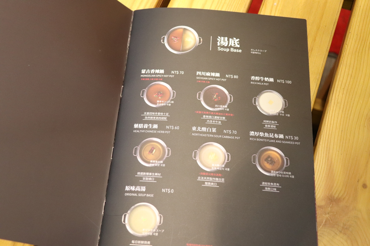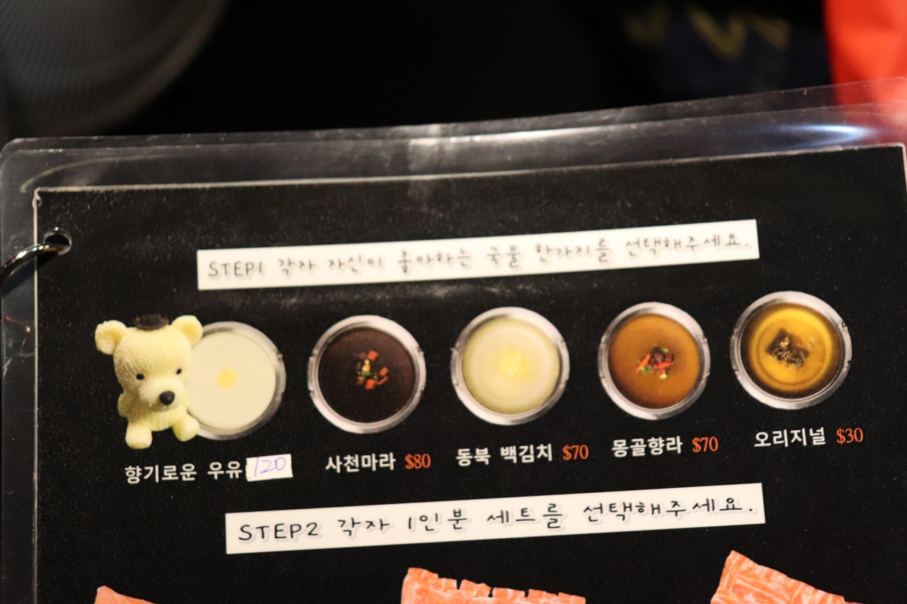 너무 다양한 메뉴들이 있어서 뭘 시킬까 고민을 하다가 저희는 1,680NT(약 67,000원)을 시켰습니다. 그리고 육수는 향기로운 우유, 사천마라 2가지를 시켰습니다. 치즈처럼 담백한걸 좋아하는 분들이라면은 향기로운 우유를 정말 좋아하지만 느끼한걸 싫어하면서 매콤한거 좋아하는 분이라면 사천마라 소스에 푹 빠지실거예여!