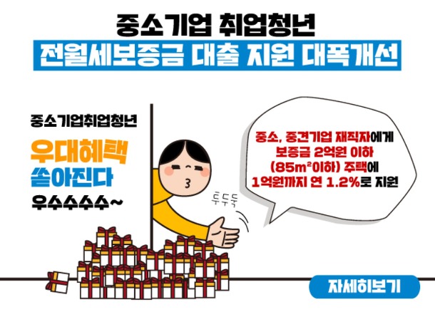 이번 포스팅에서는 중소기업에 근무를 하고 있는 자 중 전세자금을 받고싶은 분들을 위한 포스팅을 작성하려고 합니다. 여러 기관에서 점점 올라가는 집값의 부담을 줄여주기 위핸 여러 전세자금대출 정책을 펼치고 있는데 이번포스팅에서는 중시기업에 다니는 청년 대상의 정보를 알려드리겠습니다.