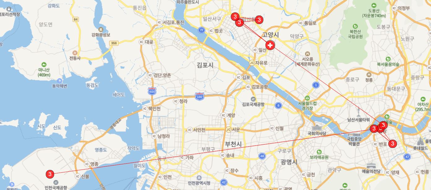 우선 사이트에 들어가면 이렇게 확진자들의 경로를 맵으로 한눈에 볼 수 있습니다. 로보트 태권브이처럼 각 확진자마다 숫자가 달려있듯이 확진자들의 경로도 숫자로 달려있습니다. 이 맵이 좋은게 가시성이 확실하죠? 전 이 맵을 보면서 우선 제가 거주하는 곳과 직장을 봤는데 아직까지도 청정지역이라 다행이네요!