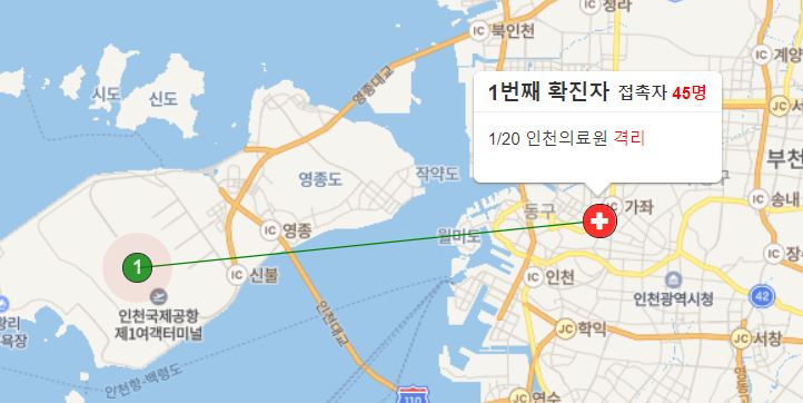 1번째 확진자를 클릭을 하지 접촉자 및 거쳐간 장소에 대한 설명이 나옵니다. 1번째 확진자 접촉자는 45명이고 1월 20일 인천의료원에에서 격리된 걸 볼 수 있습니다. 그렇다면 3번째 확진자를 한번 설명해볼까요?