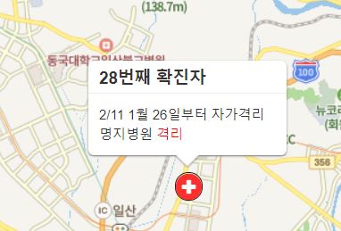28번째 지금 가장 최근에 발병된 환자로 다행인건 1월 26일로부터 자가격리였다고 합니다. 현재는 명지병원에 격리중에 있습니다. 코로나맵사이트 덕분에 국민들의 불안감이 조금이나마 해소가 될 수 있는 이유는 확진자, 완치자, 접촉자, 경로 등을 알 수 있기 때문에 스스로 마인드 컨트롤을 할 수 있다는 것입니다.
