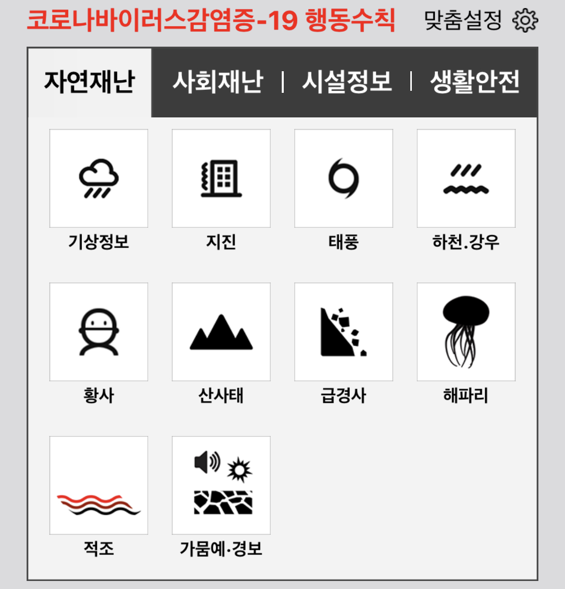 이곳에서도 내가 보고싶은것만 보고싶다면 '코로나바이러스 감염증-19 행동수칙' 우측에 '맞춤설정'을 클릭 후 내가 원하는 해당사항을 선택해서 저장을 누르면 됩니다.