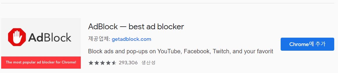 검색창에 ad block을 검색하면은 손바닥 모양으로 Adblock-best ad block이란 프로그램이 나옵니다. 제공업체는 getadblock.com이고 구매한 사람은 293,306건이고 별점은 4.5개라보면은 상당히 신뢰성 있는 확장프로그램이 아닐까 생각을 합니다.