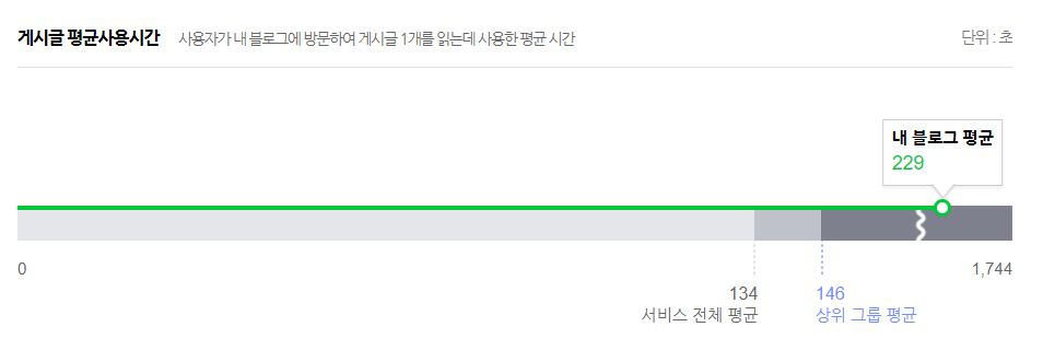 제 블로그 게시글 1개 읽는데 사용하는 평균 시간은 229초 약 3.8분 입니다. 조회수/방문자수 등은 평균보다 떨어지지만 게시글 평균사용시간은 상위그룹보다 더 높은 수준임을 알 수 있습니다. 즉, 노출도는 많지 않지만 노출되는 글에 퀄리티는 괜찮다는 의미로 보시면 좋을 것 같습니다! 이상 네이버블로그지수 블로그평균데이터로 확인하는 방법이였습니다.