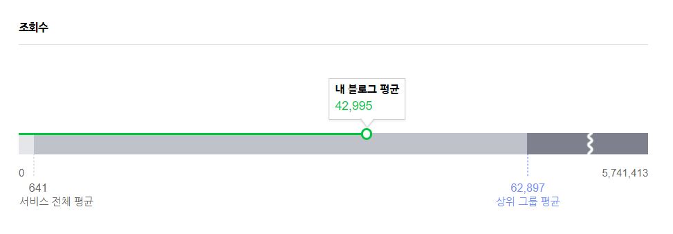 내 블로그 평균 조회수는 '42,995'입니다. 해당 조회수는 월 단위입니다. 2020년 1월 기준으로 제 조회수가 42,995였습니다. 상위 그룹 평균은 62.897이기 때문에 좀 더 분발해서 평균 이상으로 찍어야겠습니다. 평균으로 가기 위해서는 19,902건이 더 올라가야하는데 아마 정답을 글을 더 올리는 방법이겠죠?