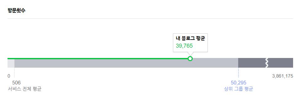방문횟수는 2020년 1월 기준 39,768명입니다. 1월이 31일이니 39,768 / 31을 하면 약 1,300이 나옵니다. 즉 평균 하루에 1,300명의 방문자가 유입됐다는 의미이며 만약에 상위 그룹 평균으로 갈라면 하루에 약 1,630명의 방문자가 유입되어야 합니다. 전 현재 시점에서 일 방문자가 800명이기 때문에 상위그룹평균 방문자수를 넘을라면 2배를 넘겨야 할 것 같습니다. 그만큼 더 열심히 해야한다는 의미겠죠?