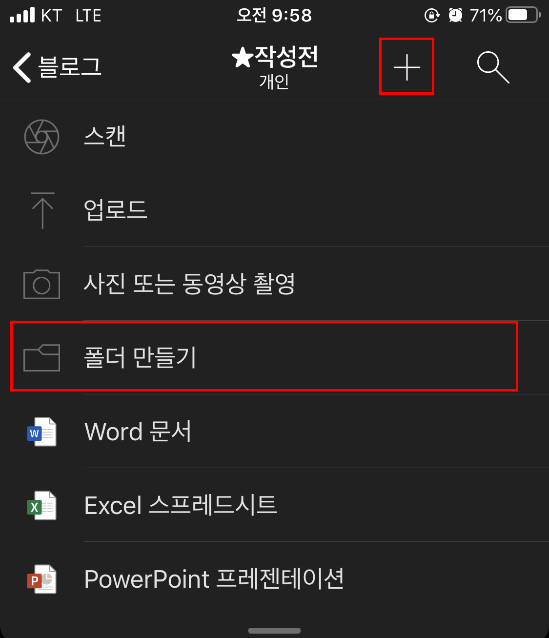 아까처럼 우측 상단을 클릭하면 '스캔, 업로드, 사진 또는 동영상 촬영, 폴더만들기 등등'이 있는데 '업로드'를 클릭합니다. 업로드를 클릭하면 핸드폰 사진 폴더 창이 활성화가 됩니다.