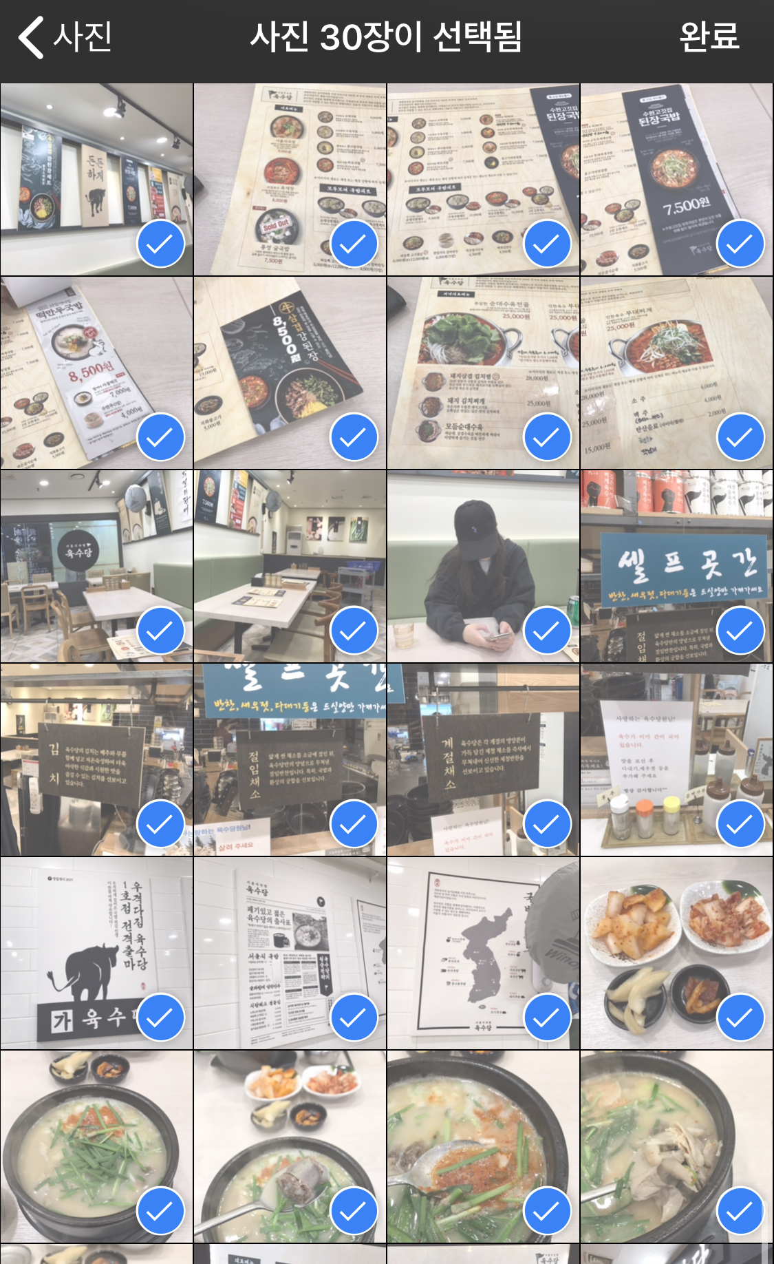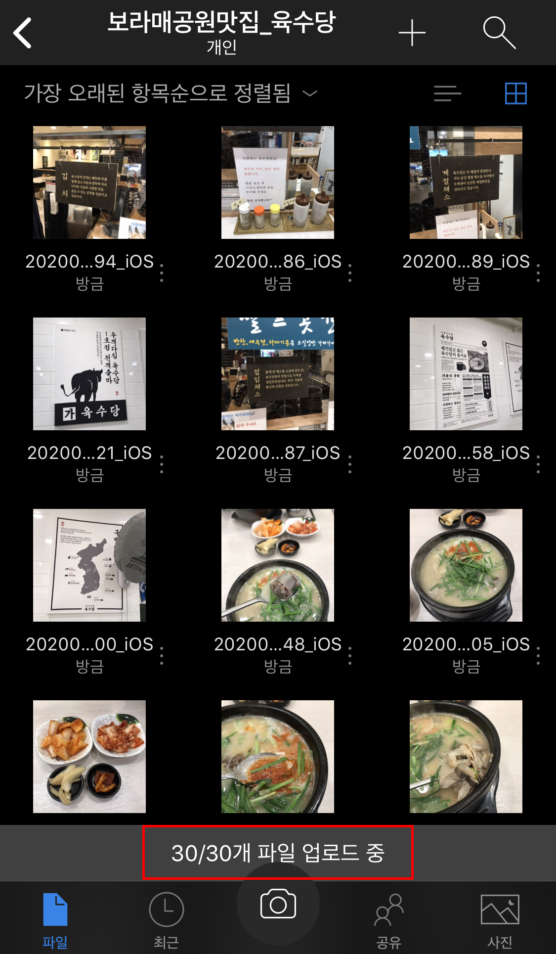 완료를 클릭하면 하단에 업로드하는 총 파일 수와 업로드 되고 있는 수가 나타납니다. 전 총 30개 사진을 업로드 하는 중이기 때문에 1/30개 파일 업로드 중 → 30/30개 파일 업로드 중으로 나타나며 업로드가 완료될 경우 '업로드 완료'라고 안내창이 뜹니다.