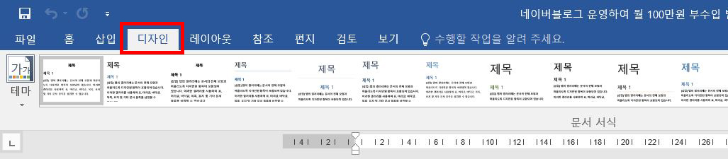 워드 위에 보시면 '디자인'이 있습니다. 디자인을 클릭하면 테마가 나오는데 테마는 무시하기고 우측 상단에 보면 '워터마크'라는 탭이 있습니다. 워터마크 탭을 누릅니다.