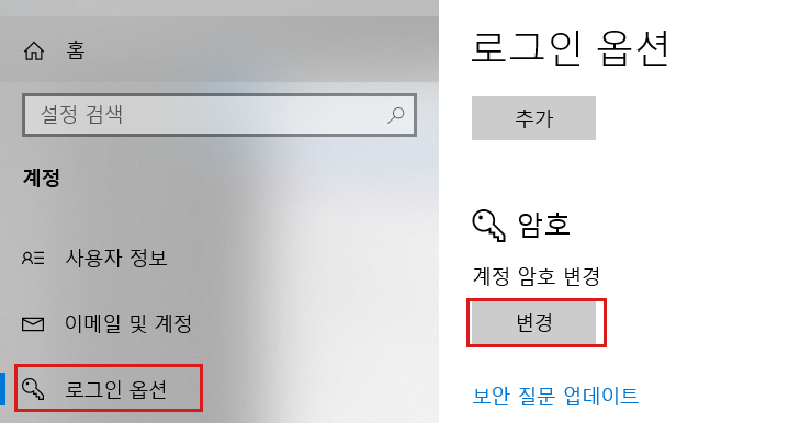 위에처럼 로그인 옵션에 들어가면 암호가 해제된 상태라 '변경'이 아닌 '추가'가 만들어집니다.
