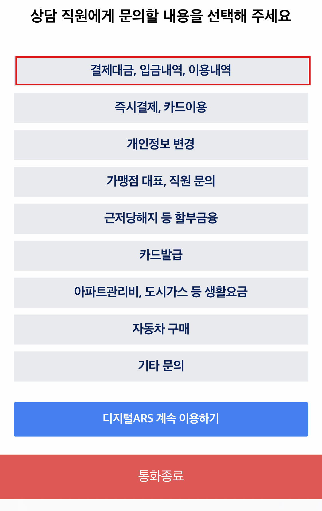 상담 직원에게 문의할 내용을 클릭하면은 삼성카드 상담원 연결로 이어집니다. 저같은 경우에는 결제대금 및 이용내역에 대해서 궁금한 점이 있어서 해당 항목을 클릭을 하니 전화연결로 이어졌습니다.
