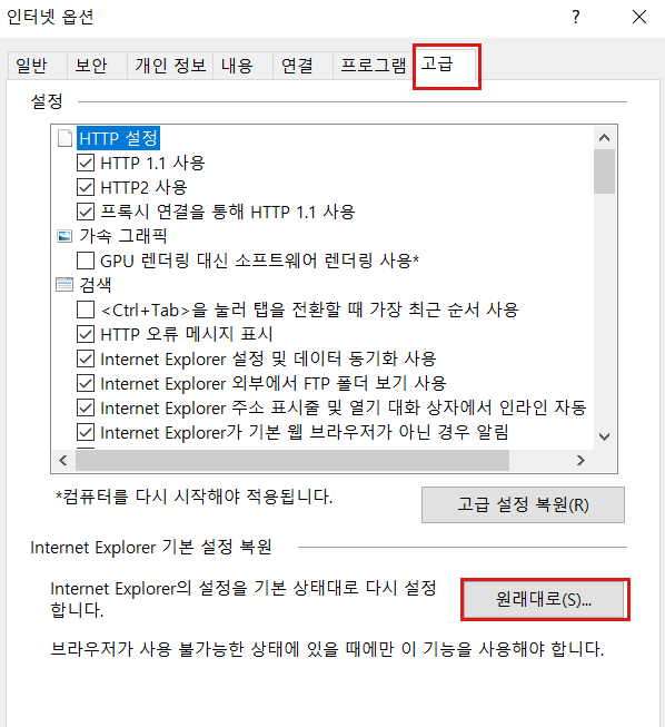 인터넷 옵션창에 들어가시면 우측 상단에 '고급-원래대로'를 클릭 하시면 됩니다. 이때에는 인터넷 익스플로러 창들을 다 꺼주신 상태에서 눌러줘야 합니다. 만약에 이렇게 해도 안될 경우에는 '고클린'이라는 프로그램을 사용하시면 됩니다.