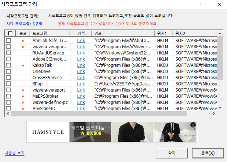 *단, 시작프로그램은 중요에 체크되어 있는건 남겨놓으시고 체크가 안되어있는 곳 중 자신에게 필요하지 않는 프로그램만 체크해서 삭제를 합니다. 예를들어 제가 드랍박스를 사용하는데 여기서 드랍박스를 삭제해버리면 시작할 때 구동이 안되기에 여기서는 유심히 보시고 삭제하셔야 합니다!