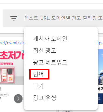 광고심사센터에 들어가서 우측 상단에 보면은 '텍스트, URL, 도메인별 광고 필터링 또는'이란 곳이 있습니다 좌측에 표면 세로줄로 된 거 보이시죠? 그곳을 클릭하면은 '게시자 도메인, 최신 광고, 광고네트워크, 언어, 크기, 광고유형'이 나타나는데 한국을 제외한 나머지 언어를 선택한 다음 적용을 클릭합니다.
