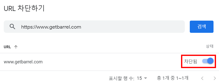광고주 URL 관리를 클릭하시면은 위에 검색을 할 수 있는 입력창이 있습니다. 내가 차단하고자 하는 URL을 복사한다음에 검색을 한 후 우측 하단에 '차단됨'으로 전환시키면 됩니다.